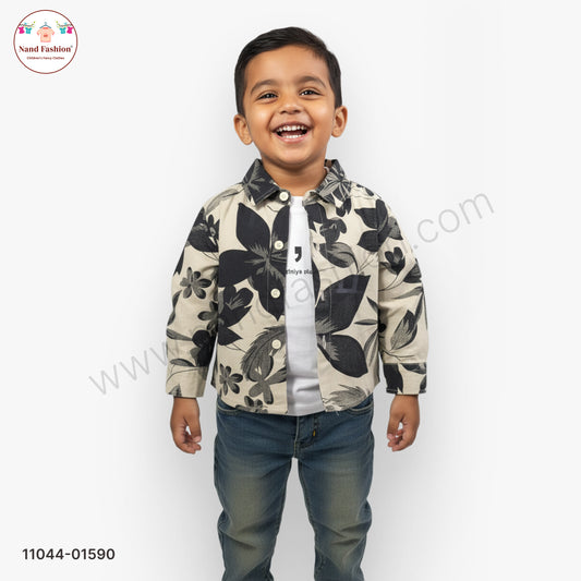 Boys Leaf Print Shirt with T-Shirt & Denim Jeans Party Wear Set