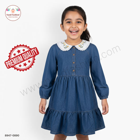 Girls Blue Denim Full Sleeve Frock with Embroidered Collar | Kids Casual & Party Wear Dress