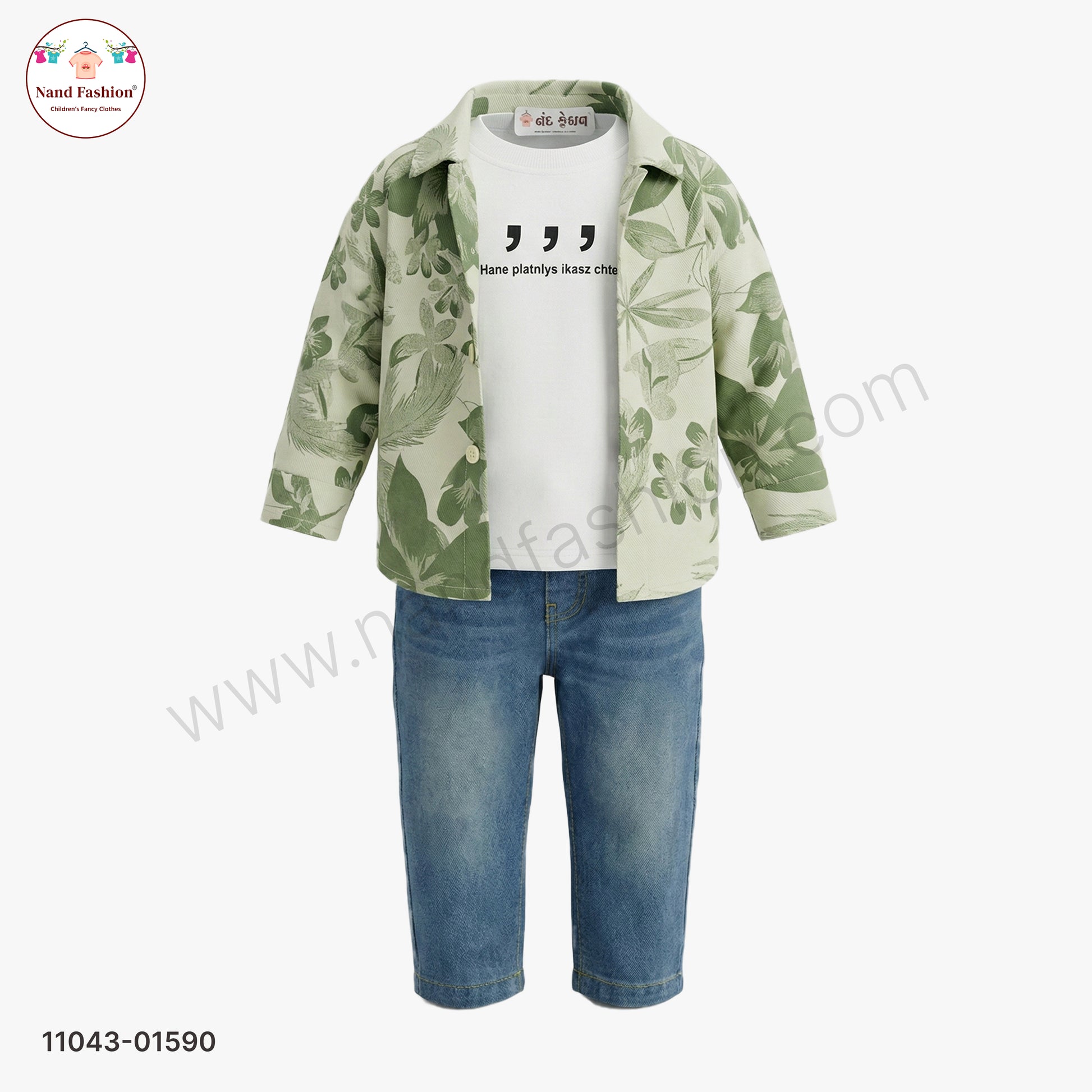 Boys Leaf Print Shirt with T-Shirt & Denim Jeans Party Wear Set