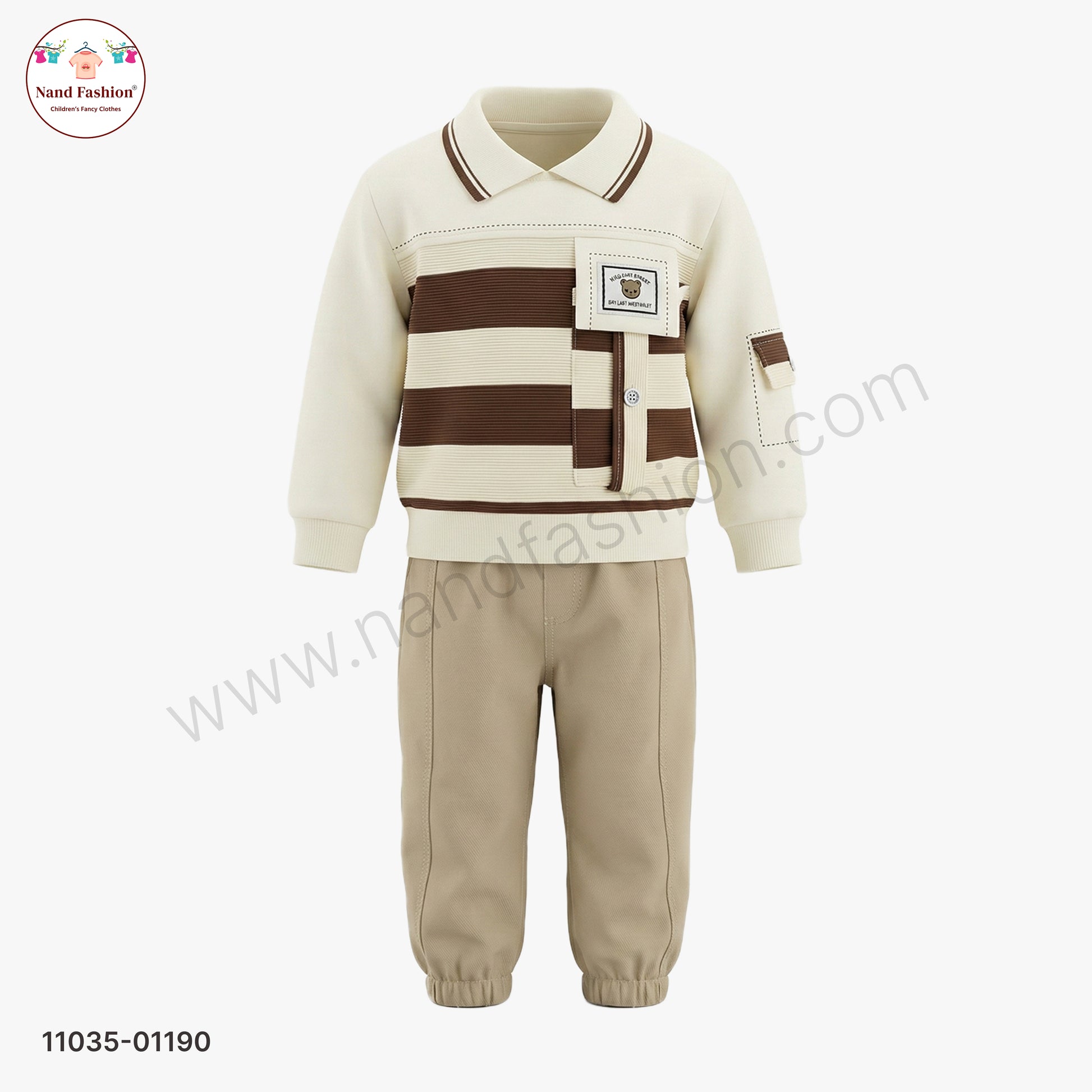 Boys Premium Winter Pair Set – Brown Stripe Collar Sweatshirt with Beige Pants Party Wear Set