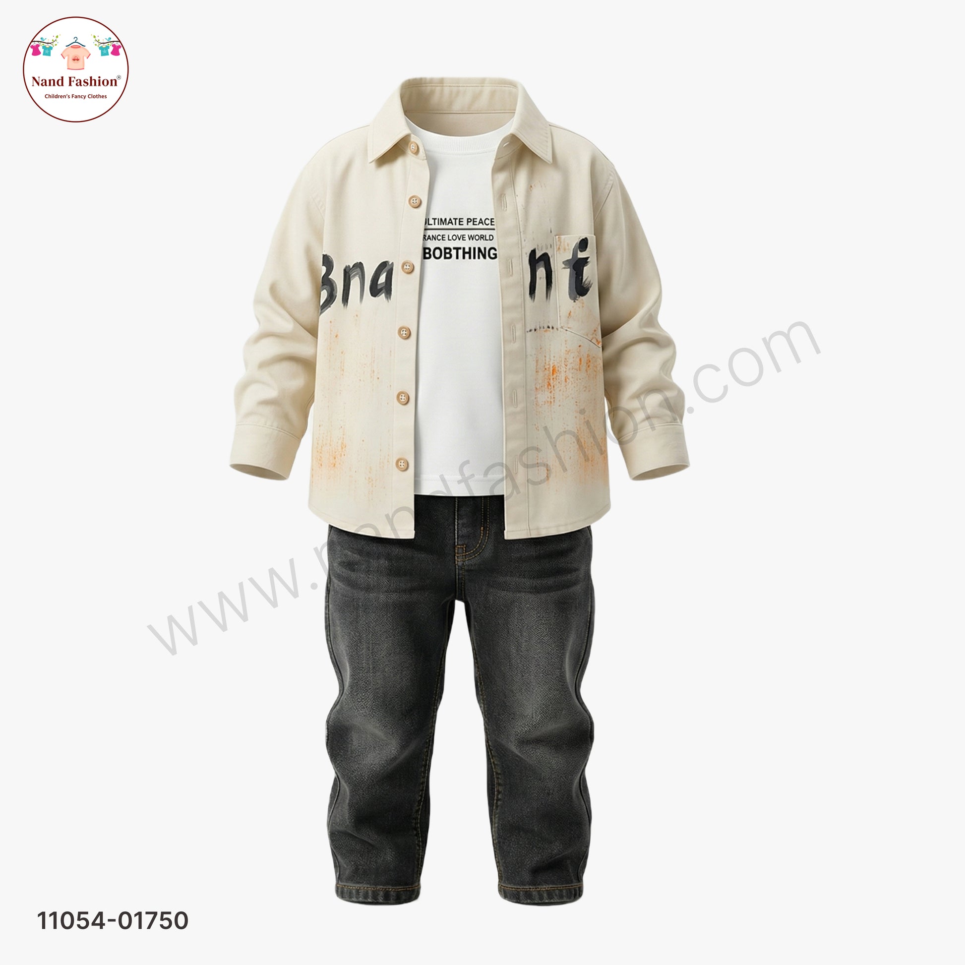 Build a wardrobe foundation with this thoughtfully assembled three-piece collection for boys. The printed beige shirt adds character and visual interest, paired with a versatile white t-shirt that works as both a standalone piece and a layering essential. The blue denim jeans complete the set with timeless appeal and reliable comfort. Each item is selected to coordinate seamlessly, allowing your son to create multiple outfit combinations from just three pieces. Crafted for durability through active play and regular laundering, this set supports his growing style while keeping getting dressed simple and stress-free.