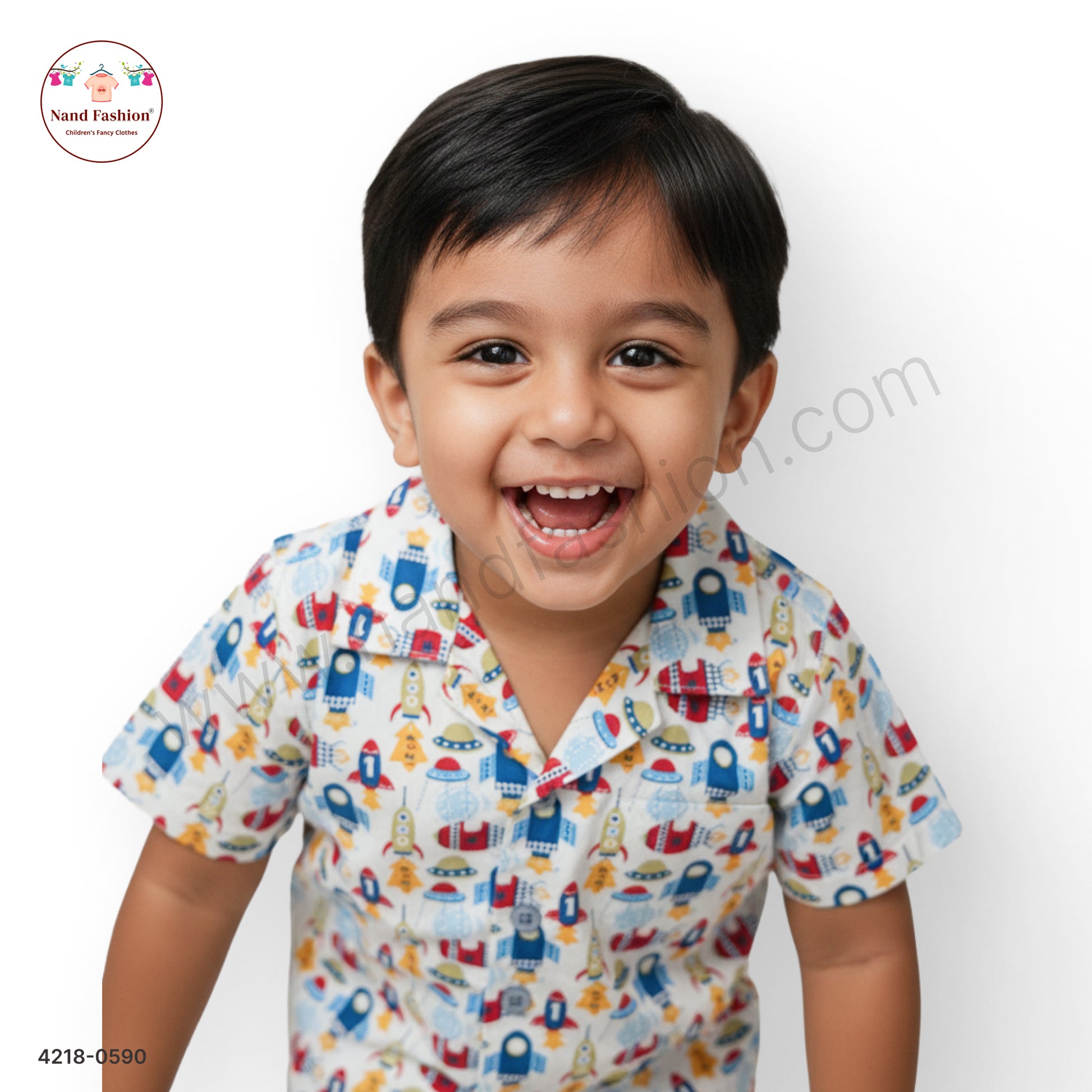 Boys White Space Rocket Print Cotton Shirt – Half Sleeve Casual Wear