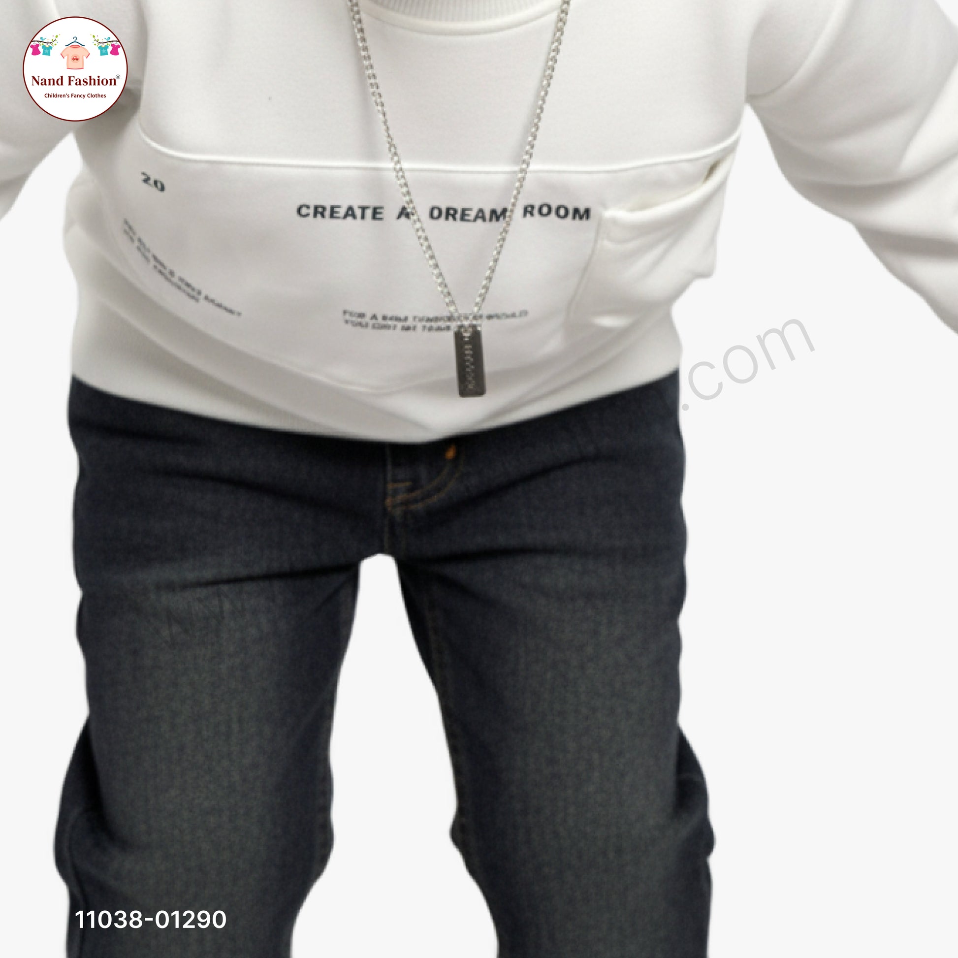 Boys White Sweatshirt with Denim Jeans Set – Winter Wear Pair Party Wear Set