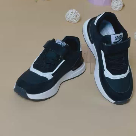 These classic black and white kids sneakers combine style and comfort for boys who love sports and casual activities. Designed as trendy running shoes, they provide reliable support for everyday wear. Perfect for active kids, these sneakers offer durability and a modern look that fits any casual outfit.