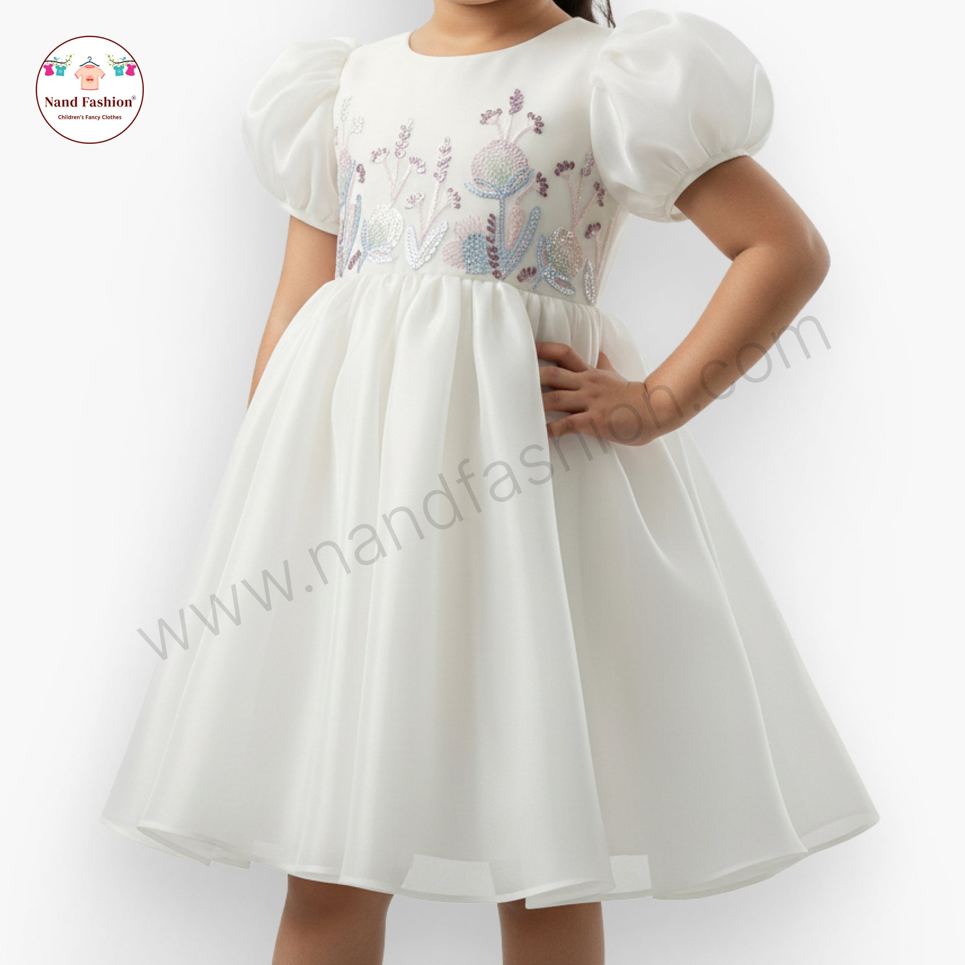 Introduce your little one to timeless elegance with this stunning white party frock. Delicate embroidery adorns the bodice, while charming puff sleeves add a touch of sophistication and playfulness. Crafted with care for special occasions, this dress combines comfort with refined style, making it perfect for celebrations, festivals, and memorable moments. The classic white hue pairs beautifully with any accessory, giving you endless styling possibilities. Watch your baby girl shine in this enchanting piece that celebrates her natural grace.