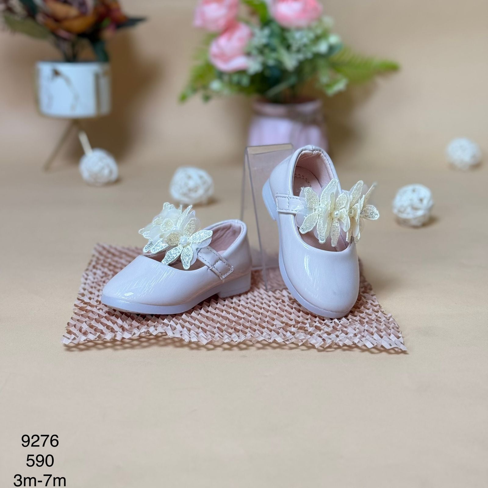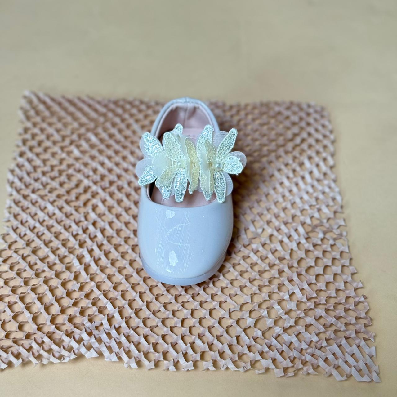 These floral embellished baby girls Mojadi shoes are perfect for special occasions and parties. Designed with delicate floral details, they add charm to your little one's outfit while providing comfortable support for tiny feet. Ideal for dressing up toddlers, these fancy shoes combine style and comfort to keep your baby looking cute and feeling cozy during those memorable moments.