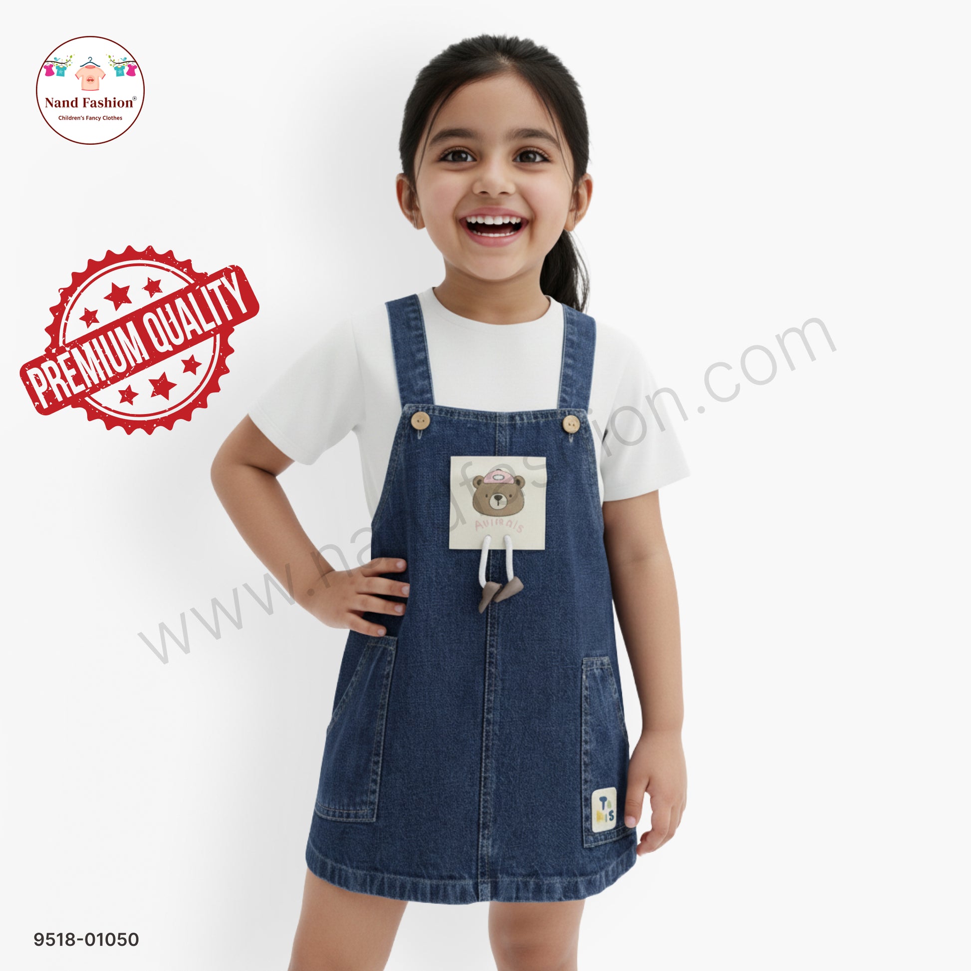 Adorable denim dungaree dress designed for active girls who love playful style. Features a charming bear patch that adds personality and character to everyday wear. The included inner top ensures comfort and complete coverage, making it perfect for school, playdates, or casual outings. Crafted from durable denim that withstands the energy of growing kids. This versatile piece pairs easily with sneakers, sandals, or boots for endless outfit combinations. A wardrobe essential that celebrates childhood fun while maintaining practical comfort.