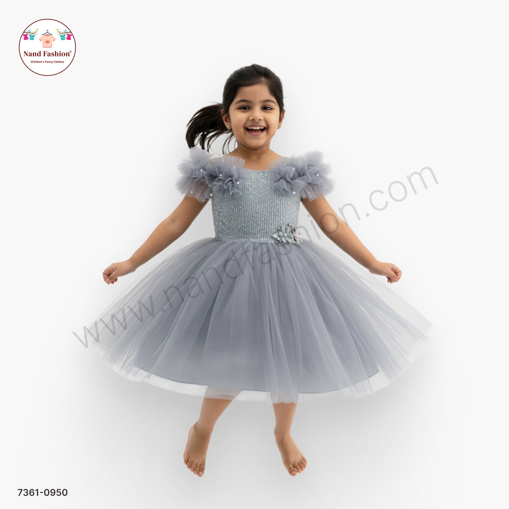 Elevate your daughter's special occasions with this charming grey net party frock. Featuring delicate ruffle sleeves that add playful movement and a stunning floral waist appliqué for an elegant touch, this dress combines style with comfort. The lightweight net fabric ensures breathability while maintaining a graceful silhouette perfect for celebrations, festivals, and formal gatherings. An ideal choice for creating memorable moments in timeless fashion.