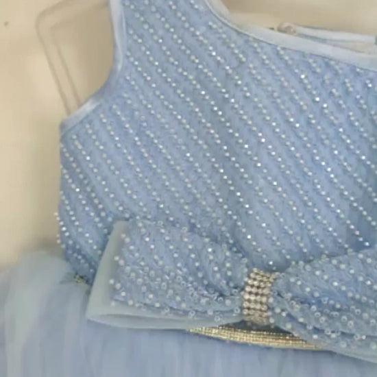 Elevate your daughter's special moments with this enchanting light blue party frock. Crafted from premium net fabric, this high-low gown features an elegant bow design that adds a touch of sophistication and charm. The flowing silhouette creates a graceful, twirling effect perfect for celebrations, we