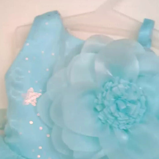 Girls Light Blue Party Wear Frock | Big Flower Design & Glitter Net Birthday Dress