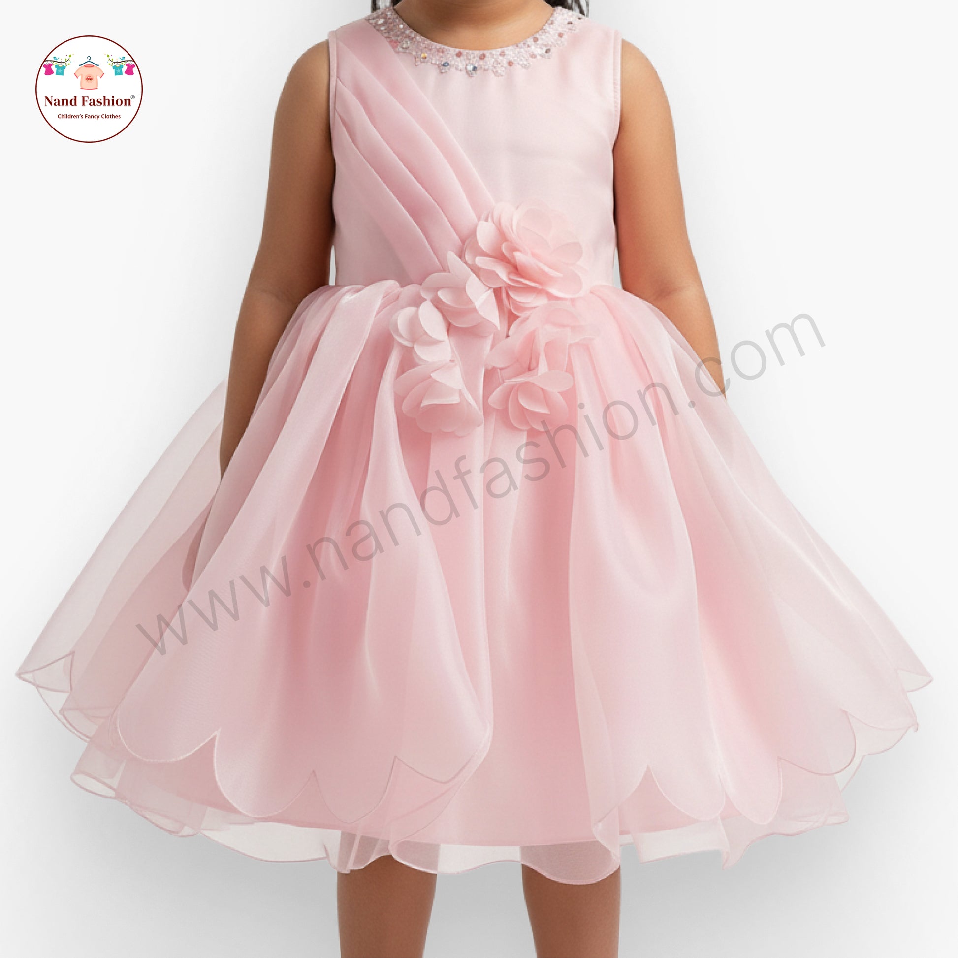 Celebrate your little one's special moments in this enchanting light pink party frock. Featuring an elegant pearl neckline and delicate floral design, this birthday dress combines sophistication with playful charm. The soft pink hue flatters all skin tones, while the thoughtfully craf