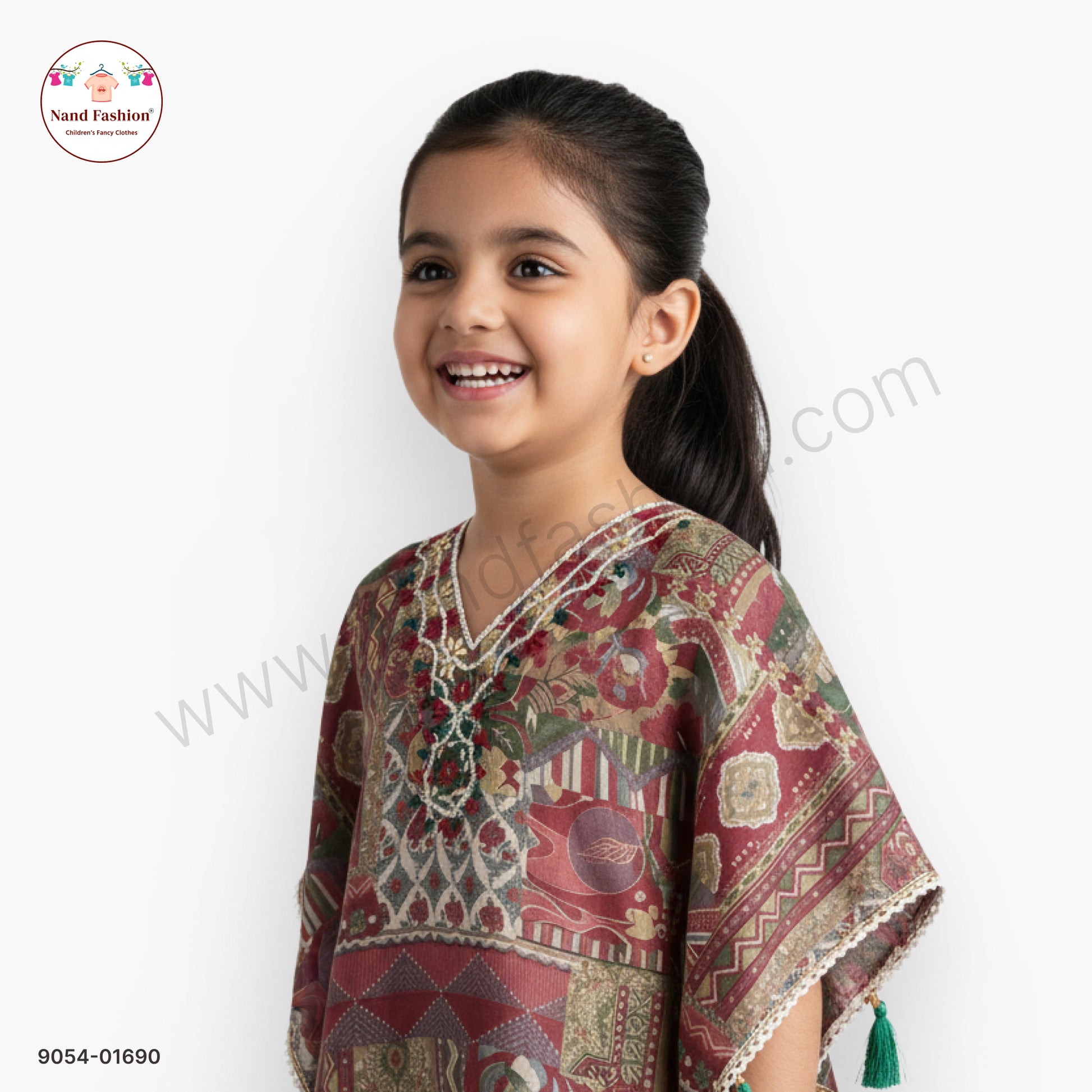Celebrate special occasions in style with this enchanting girls' kurta pant set. Featuring a striking printed design, the cape-style kurta adds an elegant flair perfect for festivals and family gatherings. Delicate tassel detailing enhances the ethnic charm, while the coordinated pants ensure a complete, polished look. Crafted for comfort and movement, this festive ensemble lets your daughter shine with confidence. Ideal for Diwali, weddings, and cultural celebrations, it's a wardrobe essential that blends traditional aesthetics with contemporary style.