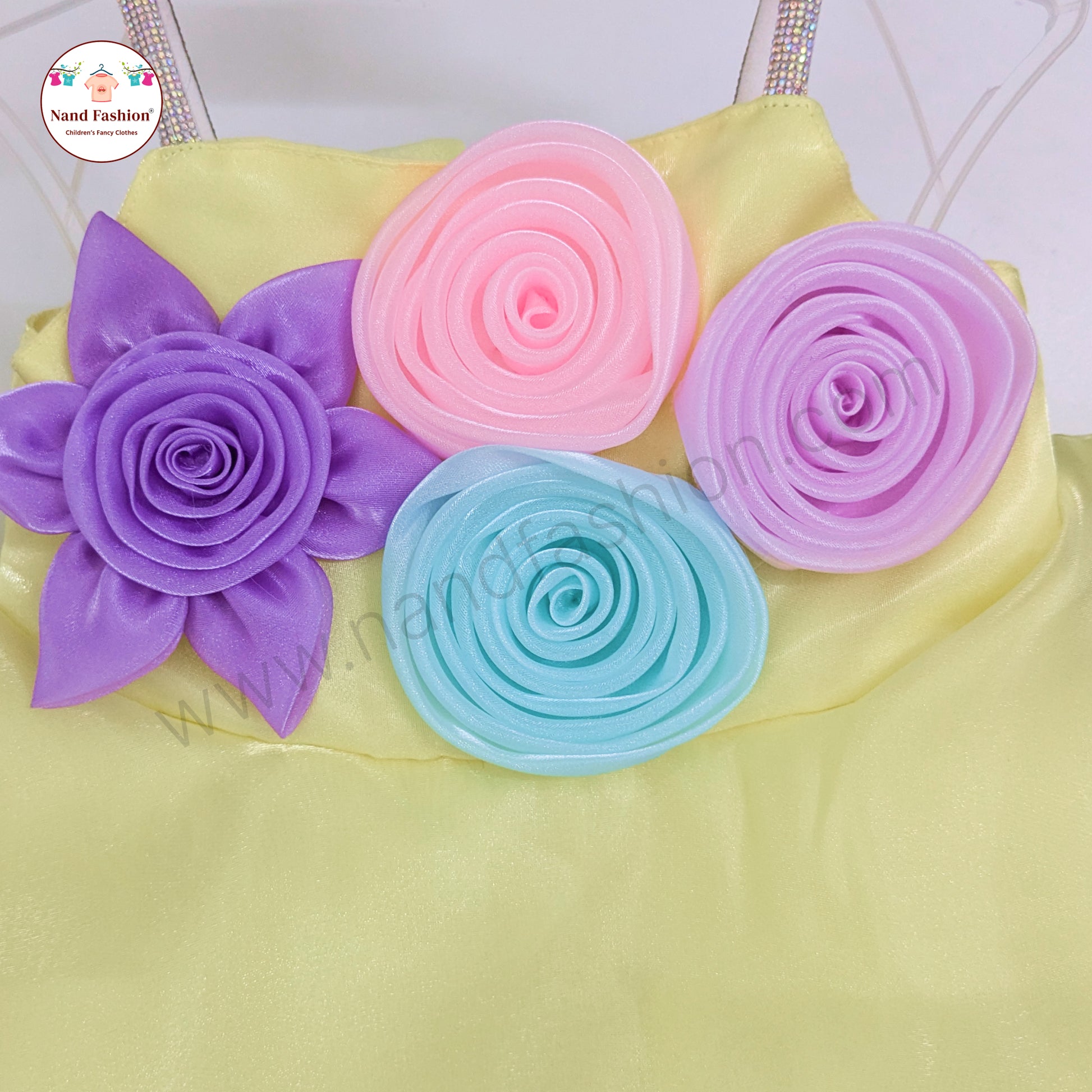 Girls Yellow Party Wear Frock | Colorful 3D Flower Design Birthday Dress
