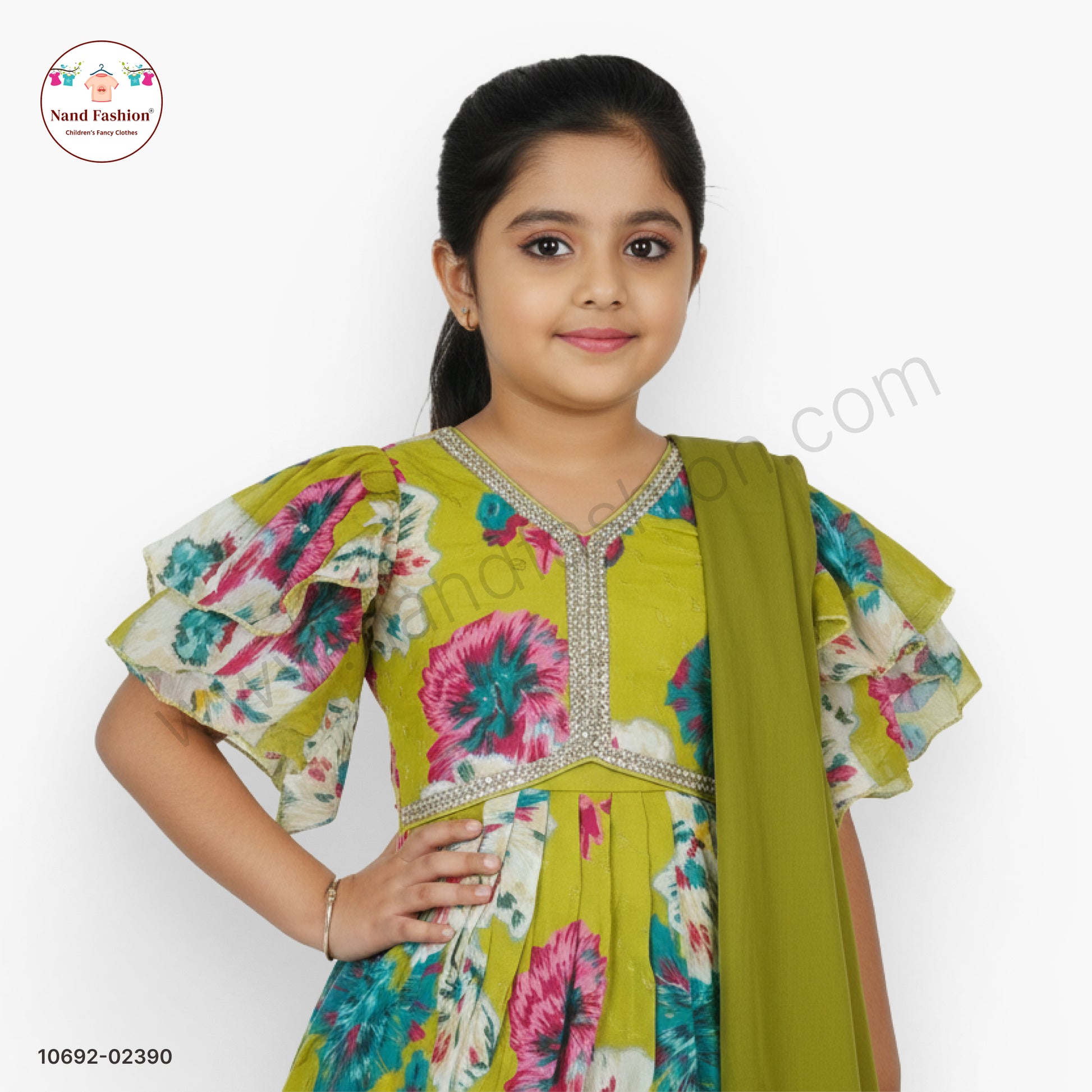 Celebrate special moments in style with this charming olive green chaniya choli set designed for young girls. The ensemble features delicate floral prints that add a touch of elegance to any festive occasion. This three-piece set includes the chaniya (skirt), choli (blouse), and dupatta (scarf), making it a complete traditional outfit. The soft, breathable fabric ensures comfort throughout the day, while the vibrant olive green hue complements various skin tones beautifully. Perfect for weddings, festivals, and cultural celebrations, this piece helps your daughter look her absolute best while honoring traditional fashion.